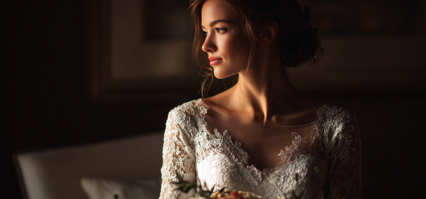 Rękaw sam w sobie działa jak biżuteria, szczególnie gdy zdobi go koronka lub delikatne aplikacje, dlatego dodatki warto dobierać z większą rozwagą niż przy prostych, odkrytych sukniach.